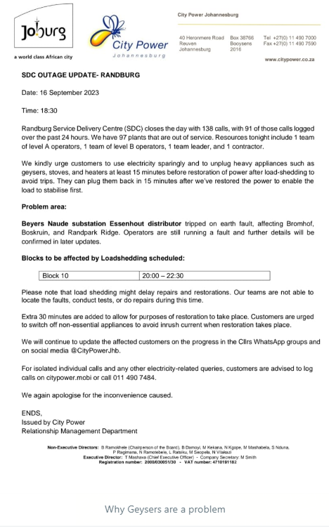 When millions of Geysers are turned on simultaneously as load shedding is ended, a sudden surge then amounts to megawatts of instant power surges through our infrastructure.